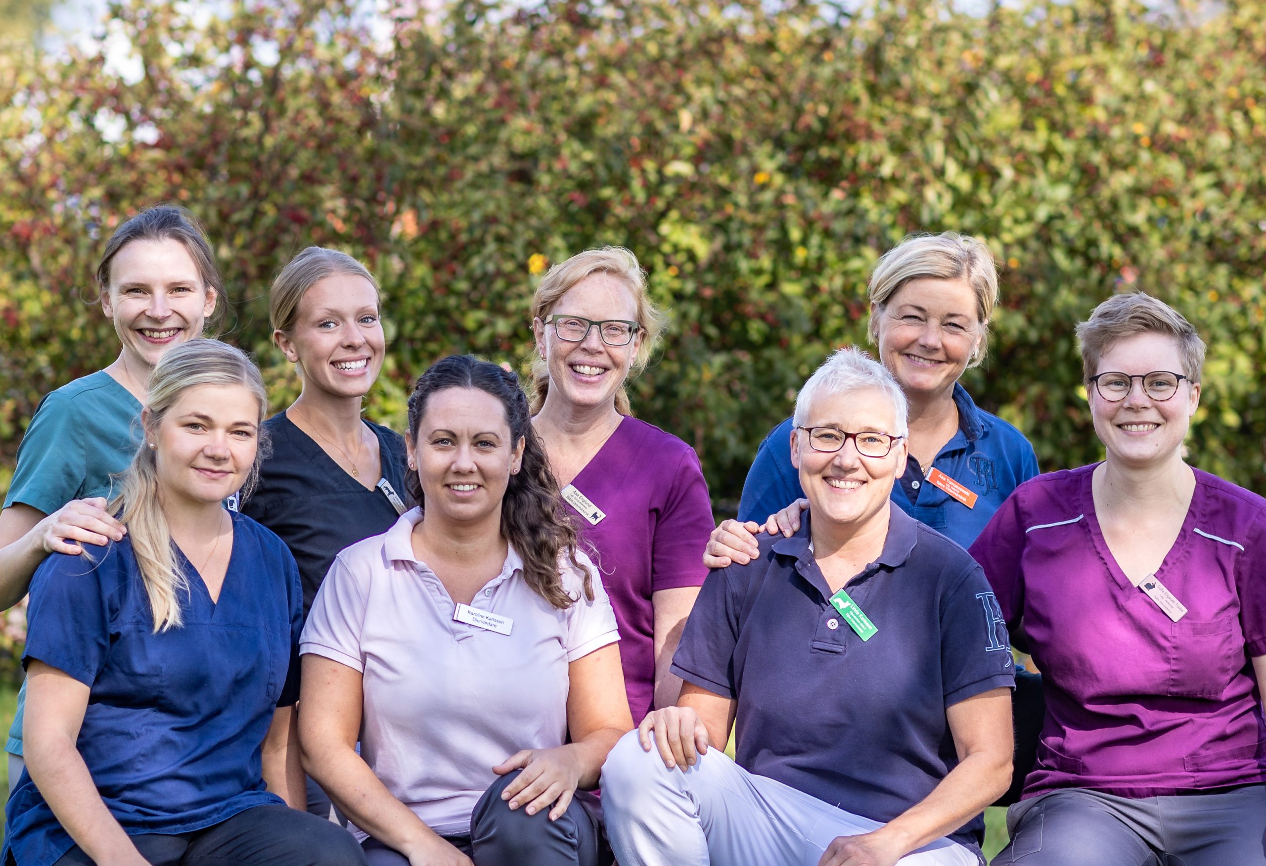 Idag är vi fyra veterinärer, två legitimerade djursjuksköterskor, två djursjuksköterskor. Tillsammans har vi stor kompetens och erfarenhet med spetskunskaper inom kirurgi, tandproblem, klåda, allergi, magtarmbesvär, endoskopering, hältundersökningar, smärtproblematik, öronproblem.